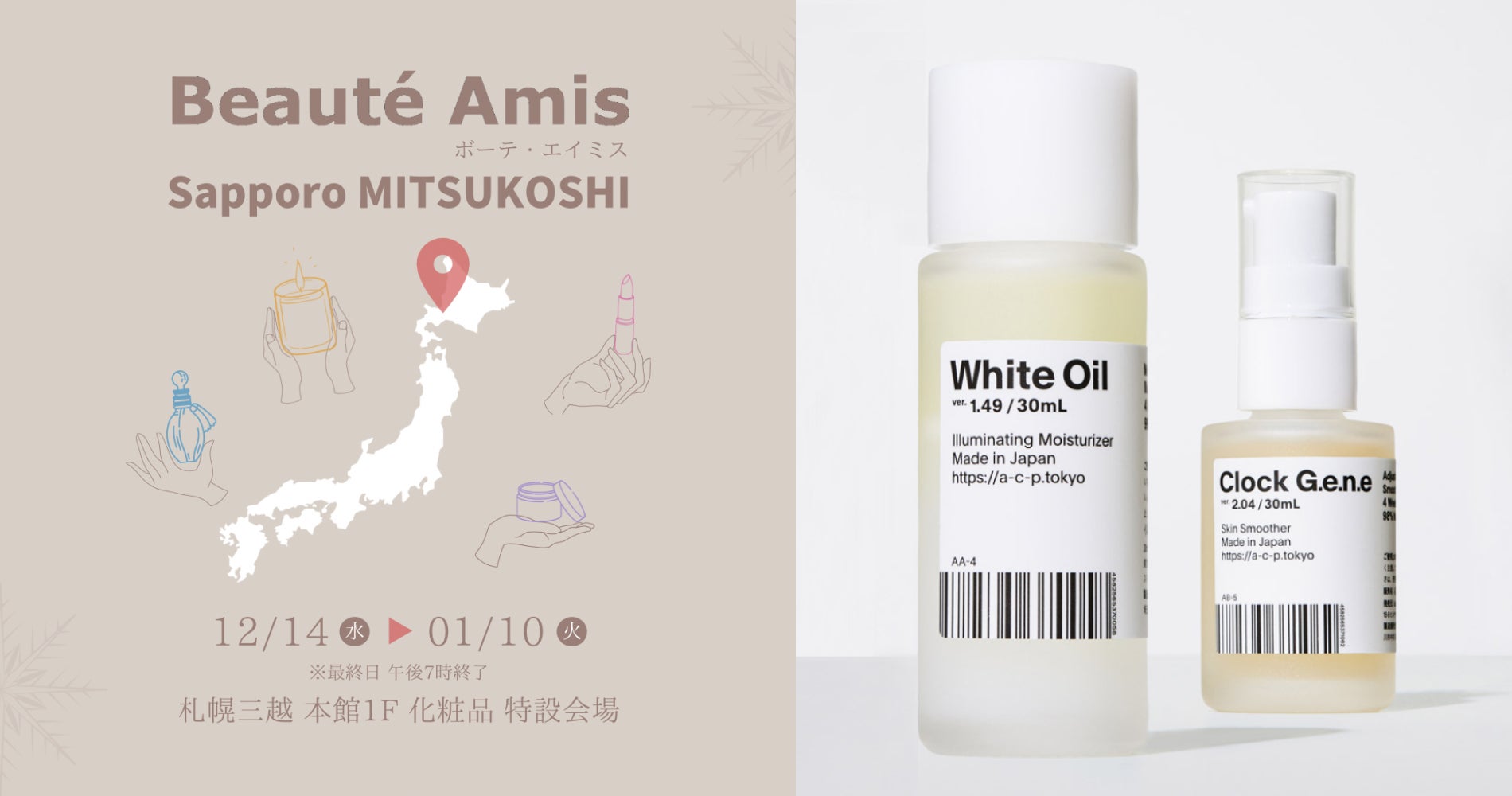 イメージではなく効果を追求し、お客さまの声で迅速(アジャイル)にアップデートをしていくブランド『AGILE COSMETICS PROJECT』(アジャイル コスメティクス プロジェクト 本社:東京都渋谷区 以下、アジャイルコスメ)は、北海道初上陸となる期間限定ショップを、札幌三越で開催の「ボーテ・エイミス」にて、2022年12月14日(水)~2023年1月10日(火)で展開いたします。また期間限定ショップでは、人気の”白いオイル“を試してみたい方におすすめの「ミニサイズセット」を12月14日(水)から、スキンケア4点がセットになったお得な「新春セット」を1月2日(月・振替休日)より、いずれも数量限定で発売いたします。