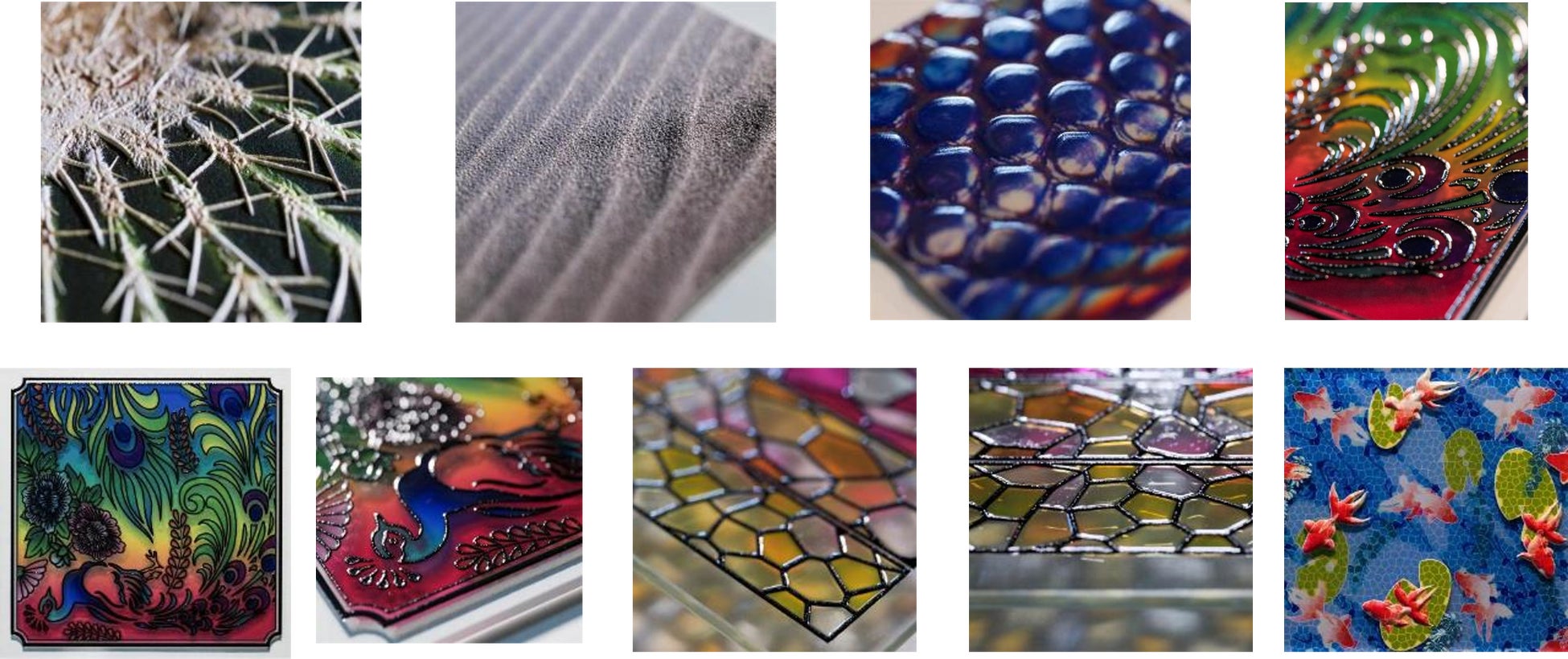サイズ/色調/質感などを精密にそして自由に表現することができるプリンターメーカー独自のインクジェット技術によって凹凸や質感などをリアルに再現することが可能にしています。2Dデータから立体プロセッシングを行い、特殊なインクジェットで出力を行います。立体表現や質感表現、繊細な形状、様々な素材(金属、ガラス、木材など幅広い基材)への表現が可能となっています。