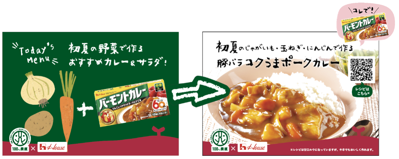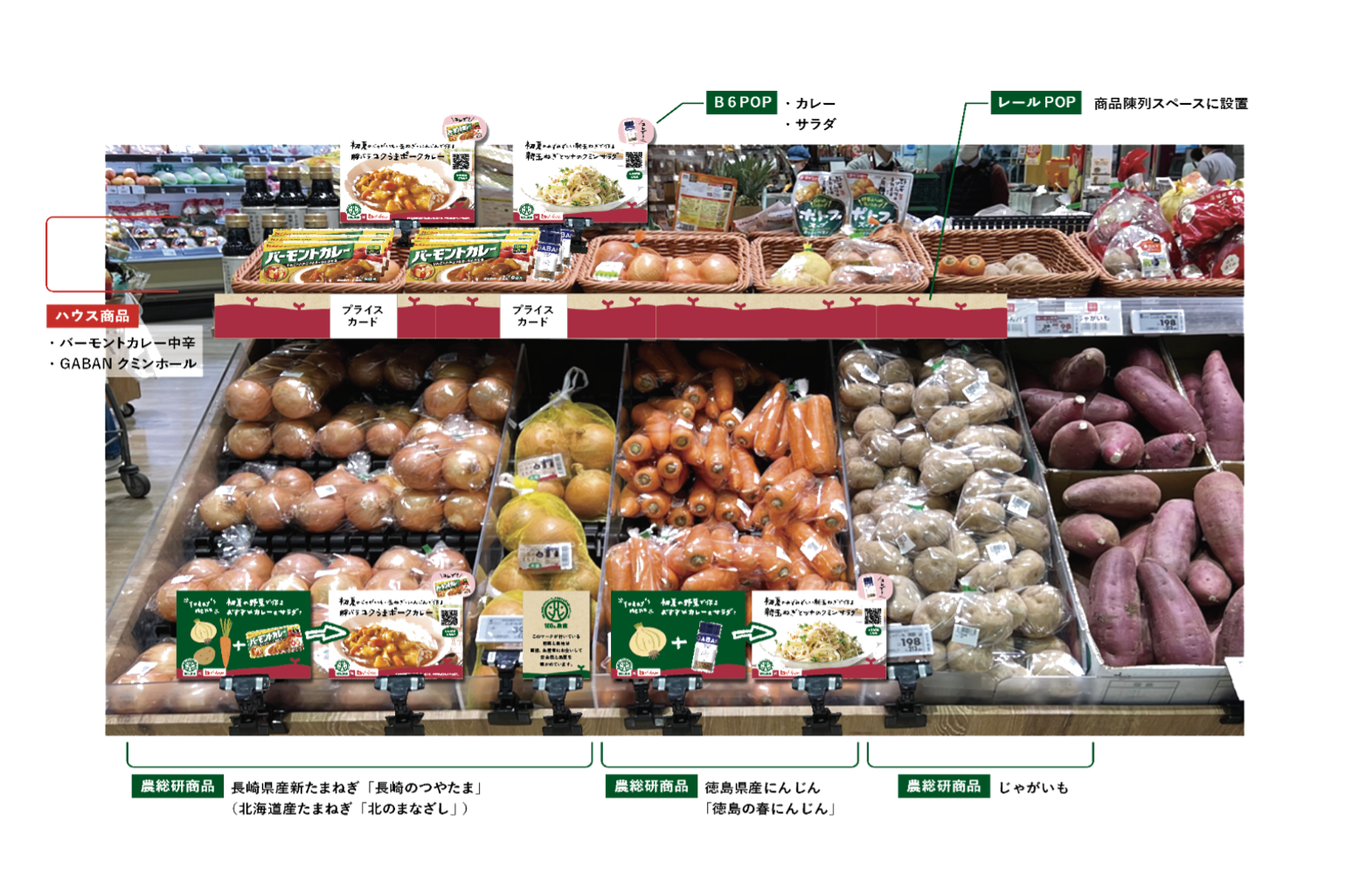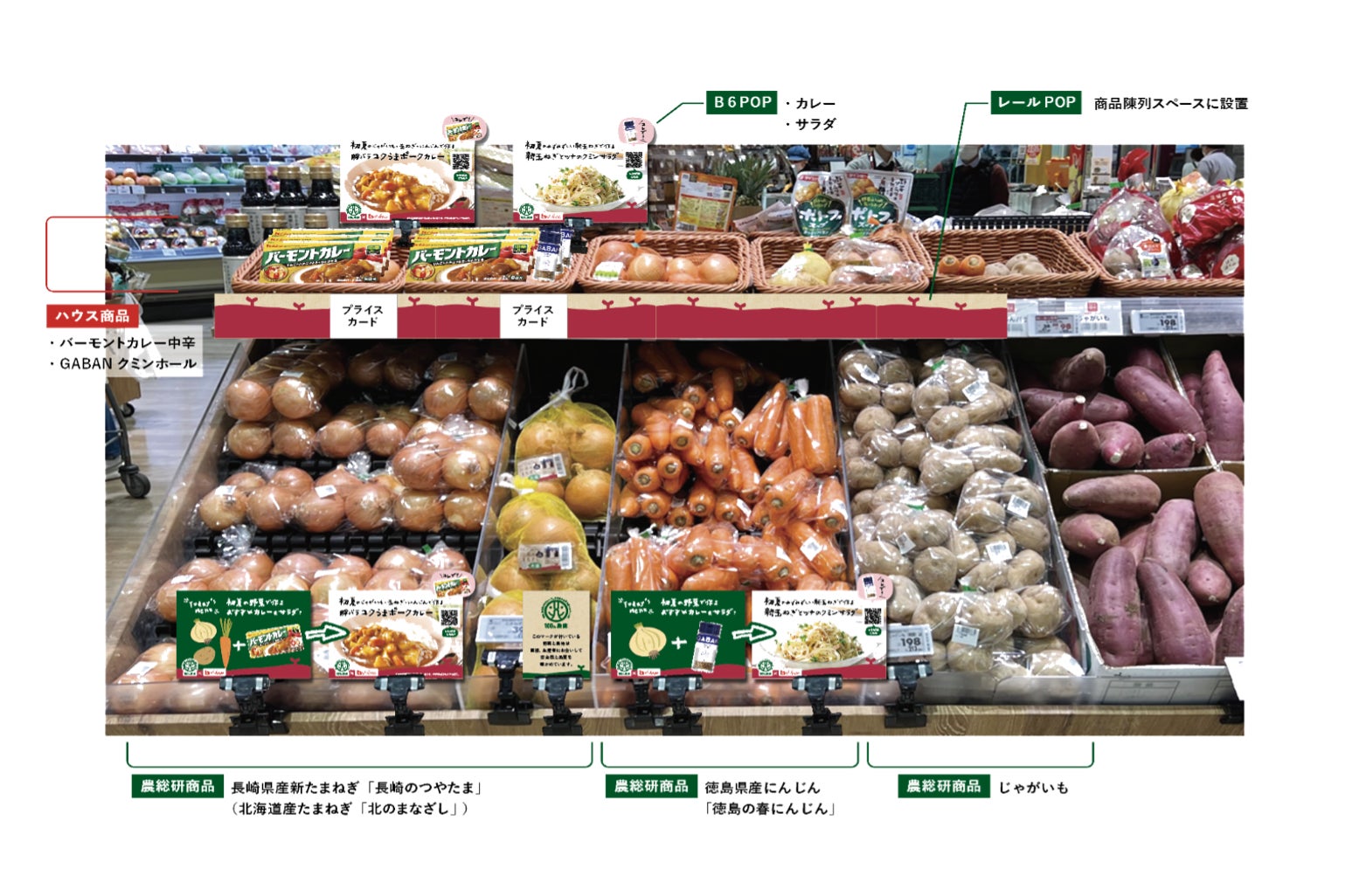 具体的には、2023年4月13日付けで資本業務提携契約を締結したハウス食品グループ本社株式会社(本社:大阪府東大阪市、代表取締役社長:浦上博史、以下「ハウス食品グループ本社」)の中核事業会社であるハウス食品株式会社の「バーモントカレー中辛」「GABAN®バジル」「GABAN®クミン」と、当社の手がける産地直送の「(徳島県産にんじん)徳島の春にんじん」「(長崎県産新玉ねぎ)長崎のつやたま」「(鹿児島県産新じゃがいも)できれば煮てほしいニシユタカ」を同じ売り場で購入することができます。(4月28日時点:農産物は旬のものを美味しく味わっていただくため、時期に応じて変更となります)。