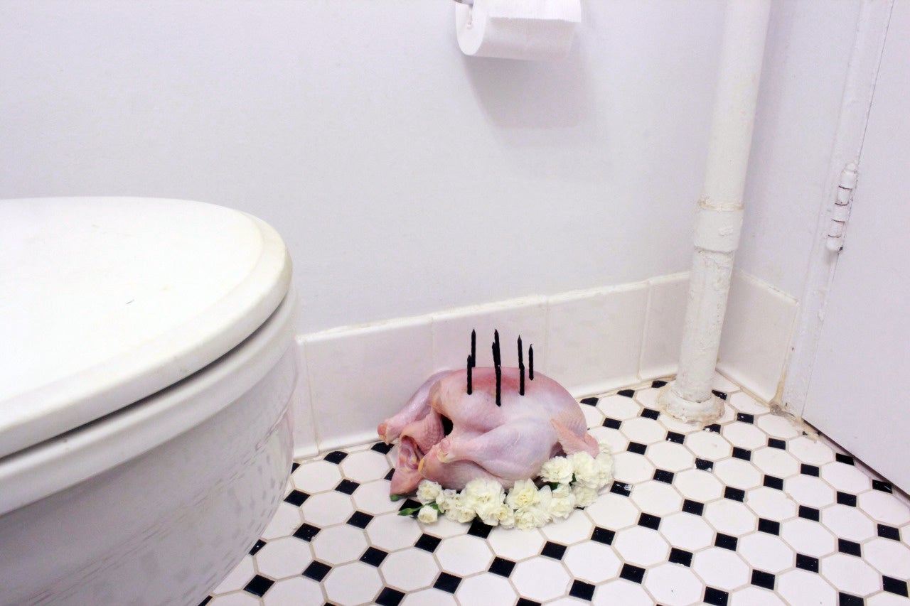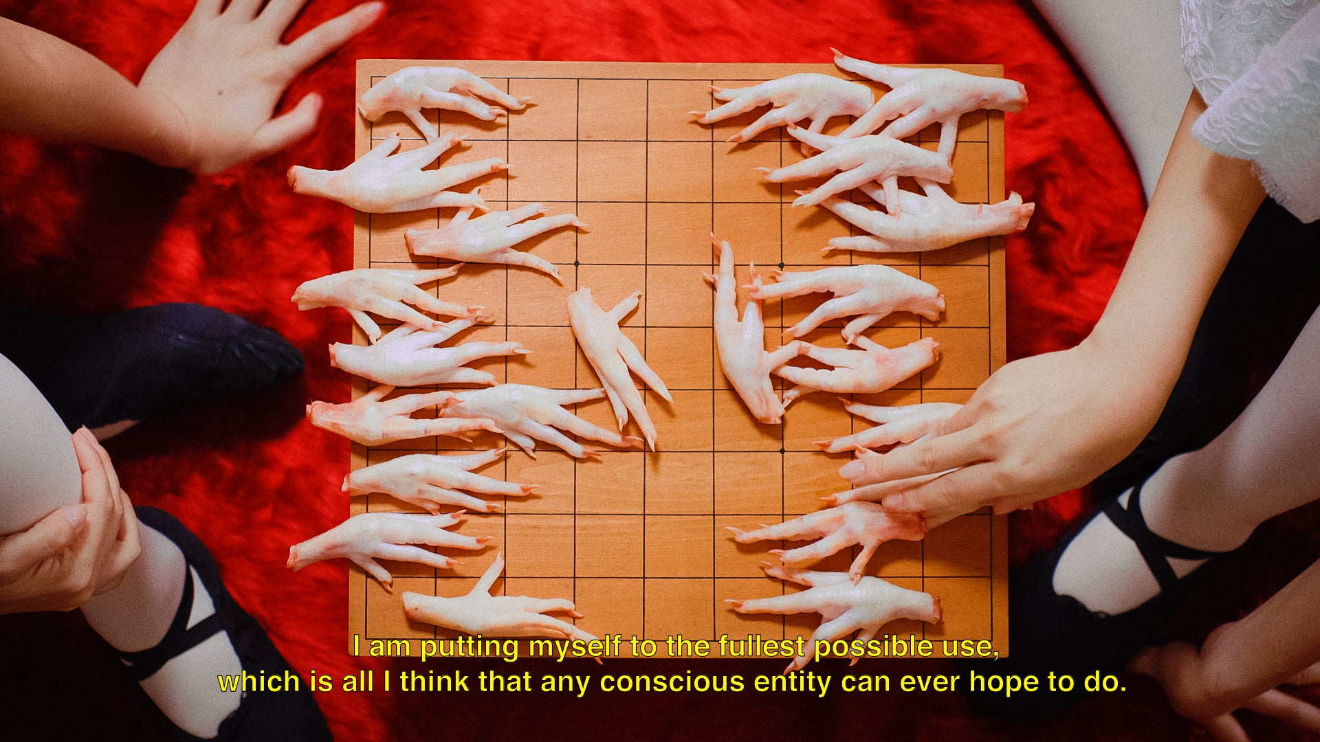 近年、私たち人間と動物との関係については、食の問題にとどまらず、ウールや毛皮などをつかった装飾品や皮革製品の使用、ペットショップや動物園のありかたに至るまで、様々な議論が行われています。「ヴィーガン」など、動物を消費しないライフスタイルを表す様々な概念も生まれていますが、篠原は、作品を通じて特定の立場を賛美することはせず、むしろ言葉にしないために作品を制作しているのかもしれません。