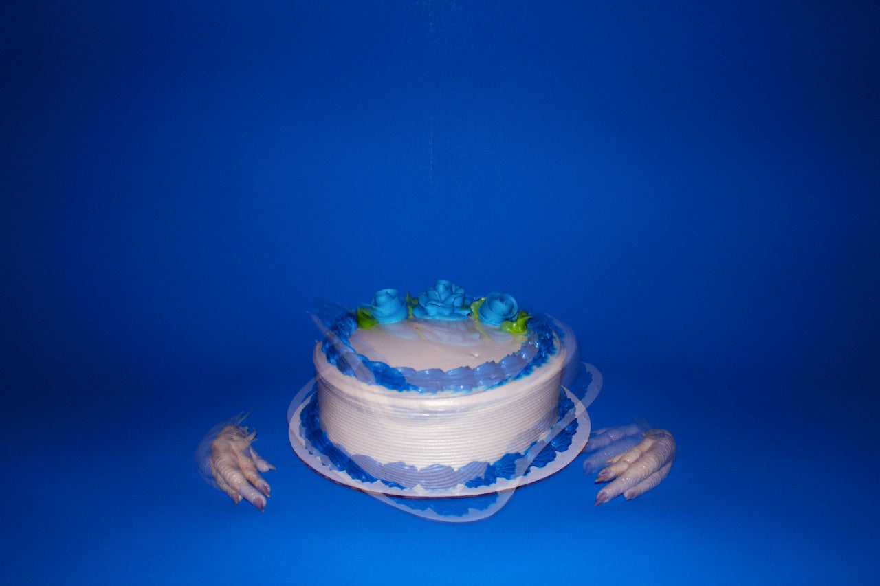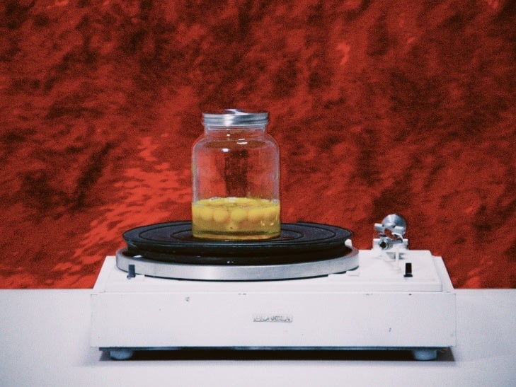 篠原唯紀は、私たちの生活が他の生物(とくに食物としての動物)を犠牲にして成り立っていることをテーマに作品を制作してきました。「FROZEN SUPERMARKETS」というタイトルも、人間が動物を消費し続ける構造が止められないことを象徴しています。本展で発表される作品は、篠原が音楽活動を通じてクラブカルチャーと密接に関わりながら得た感覚を、自身のテーマと重ね合わせることで制作されました。「音止めなし」のDJやバレエのピルエットなどが回り続けるのを良しとするように、何度でも再生される音楽は、くり返される輪廻転生をも連想させます。