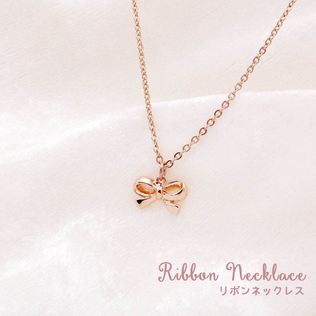 色は肌なじみがよく、様々な服装によく合わせやすいピンクゴールドのリボンネックレス。