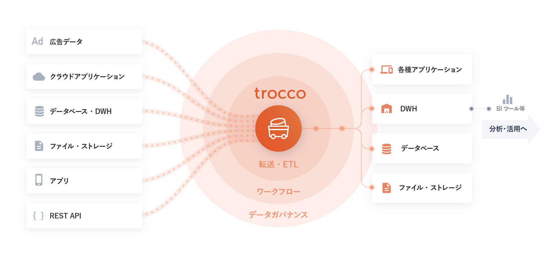 「trocco®」は、ユーザーの持つ膨大かつさまざまな種類のデータを自動で統合し、データ活用を効率化するクラウド型サービスです。