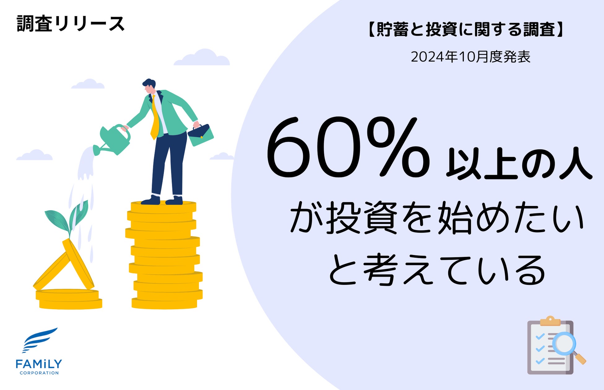 株式会社ファミリーコーポレーション(東京都中央区、代表取締役:冨吉 範明)は、2024年9月に全国の社会人男女1,000名を対象に、「貯蓄と投資に関するアンケート」調査を実施いたしましたので、その調査結果をお知らせいたします。