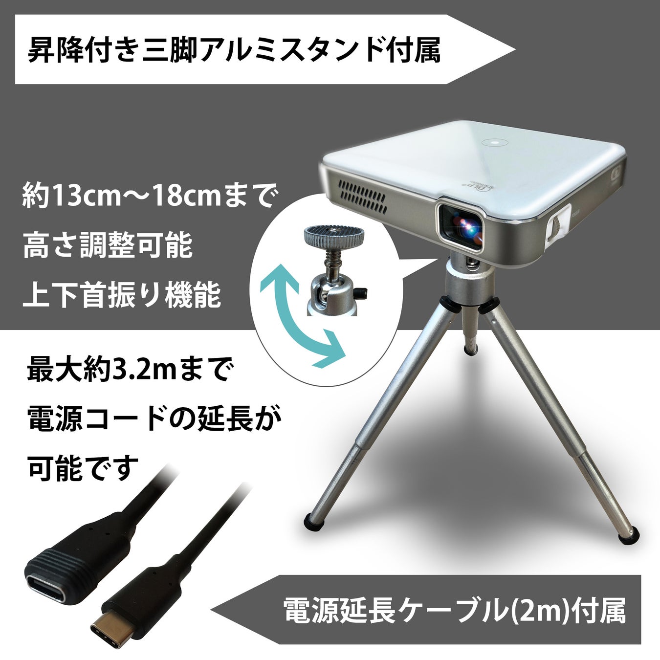 Type-C電源延長ケーブル(2m)、三脚アルミスタンド、保証書付取扱説明書
