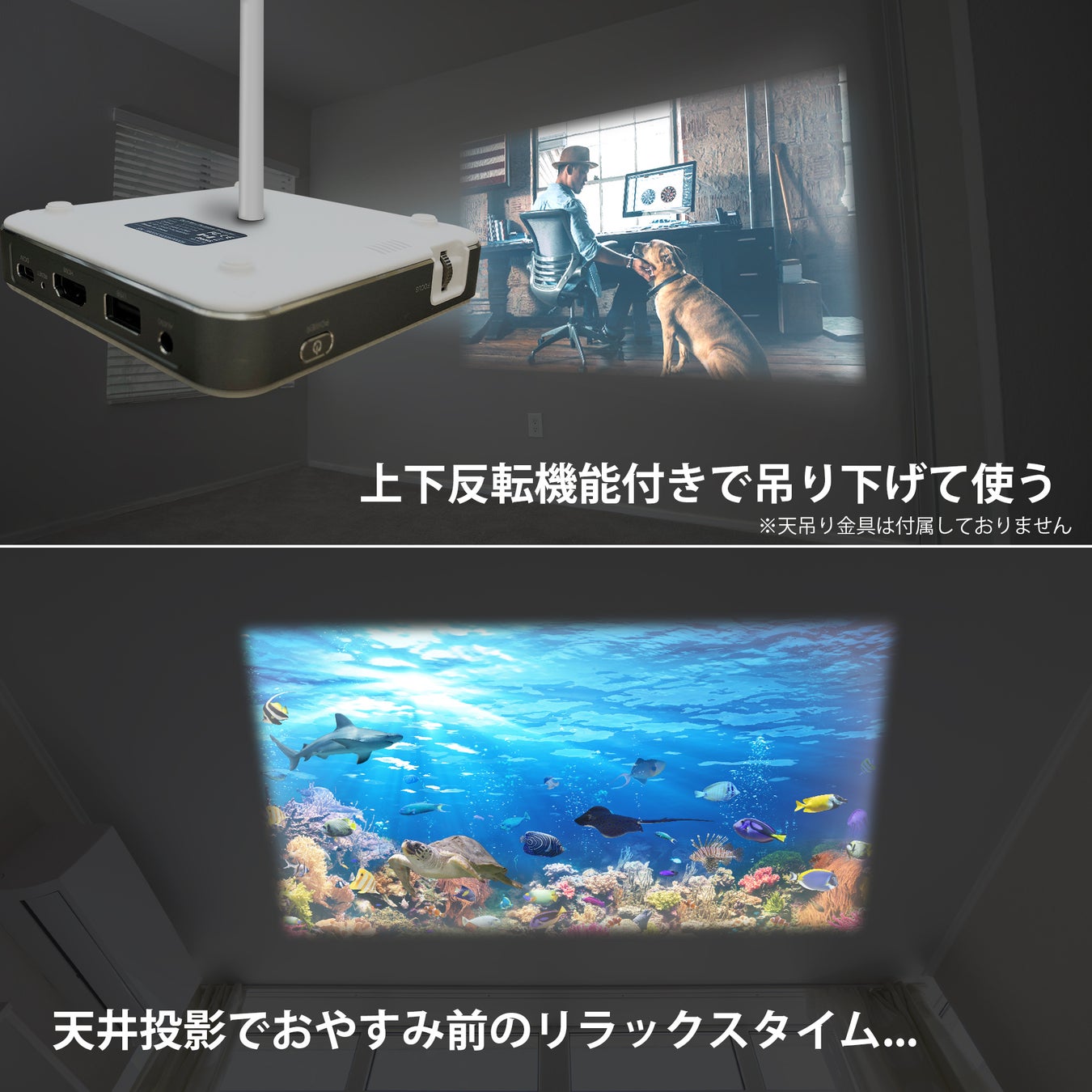 さらにベット頭上へ取付すれば白い天井へも投影可能です!(別売の天吊り金具や可変式スタンドが必要です。)