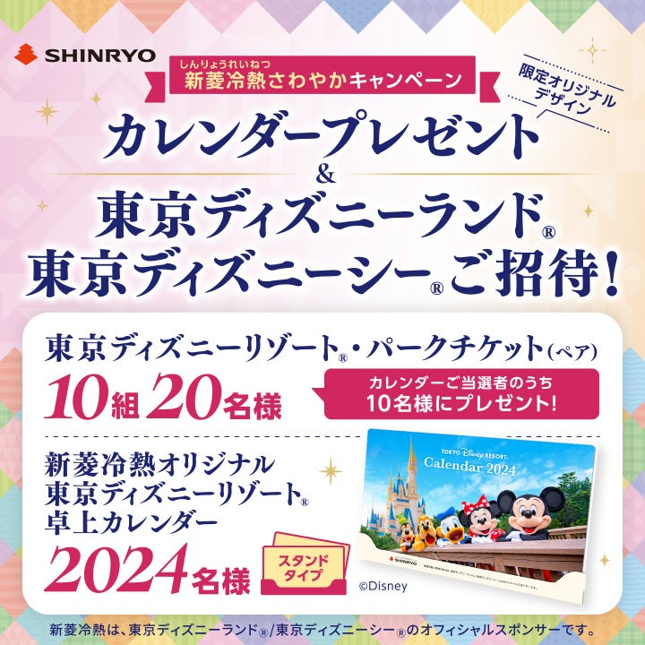 新菱冷熱工業株式会社は、2023年10月17日~2023年12月1日、2024名様に“新菱冷熱オリジナル東京ディズニーリゾート®卓上カレンダー”が、カレンダー当選者の中から抽選で10組20名様に“東京ディズニーリゾート®・パークチケット(ペア)”が当たるオープンキャンペーンを開催いたします。