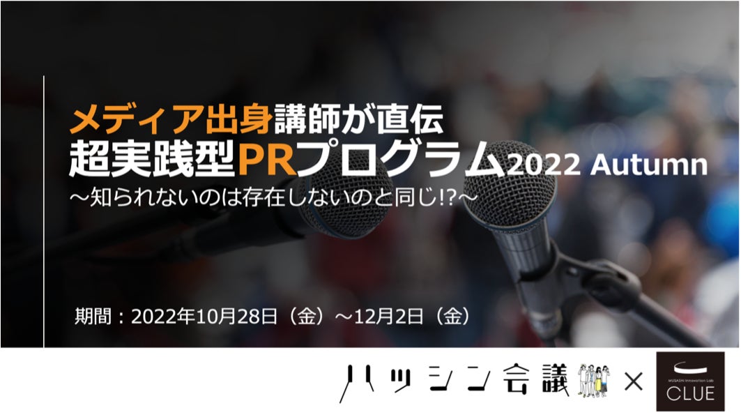 武蔵精密工業株式会社(本社:愛知県豊橋市、代表取締役社長:大塚浩史、以下ムサシ)が運営するMUSASHi Innovation Lab CLUE(住所:愛知県豊橋市駅前大通一丁目135番地 ココラアベニュー3F、2018年12月設立)は、株式会社ハッシン会議(本社:東京都港区、代表取締役:井上千絵)と共に2022年10月28日(金)より約1カ月間の「超実践型PRプログラム 2022 Autumn(以下、本プログラム)」を開催致します。本プログラムは中部地方のスタートアップや企業内の新規事業担当者に向けて、事業を加速させていくPR力育成を目的としており、最終日には記者発表会見の場でメディアに向けたプレゼンテーションを行います。