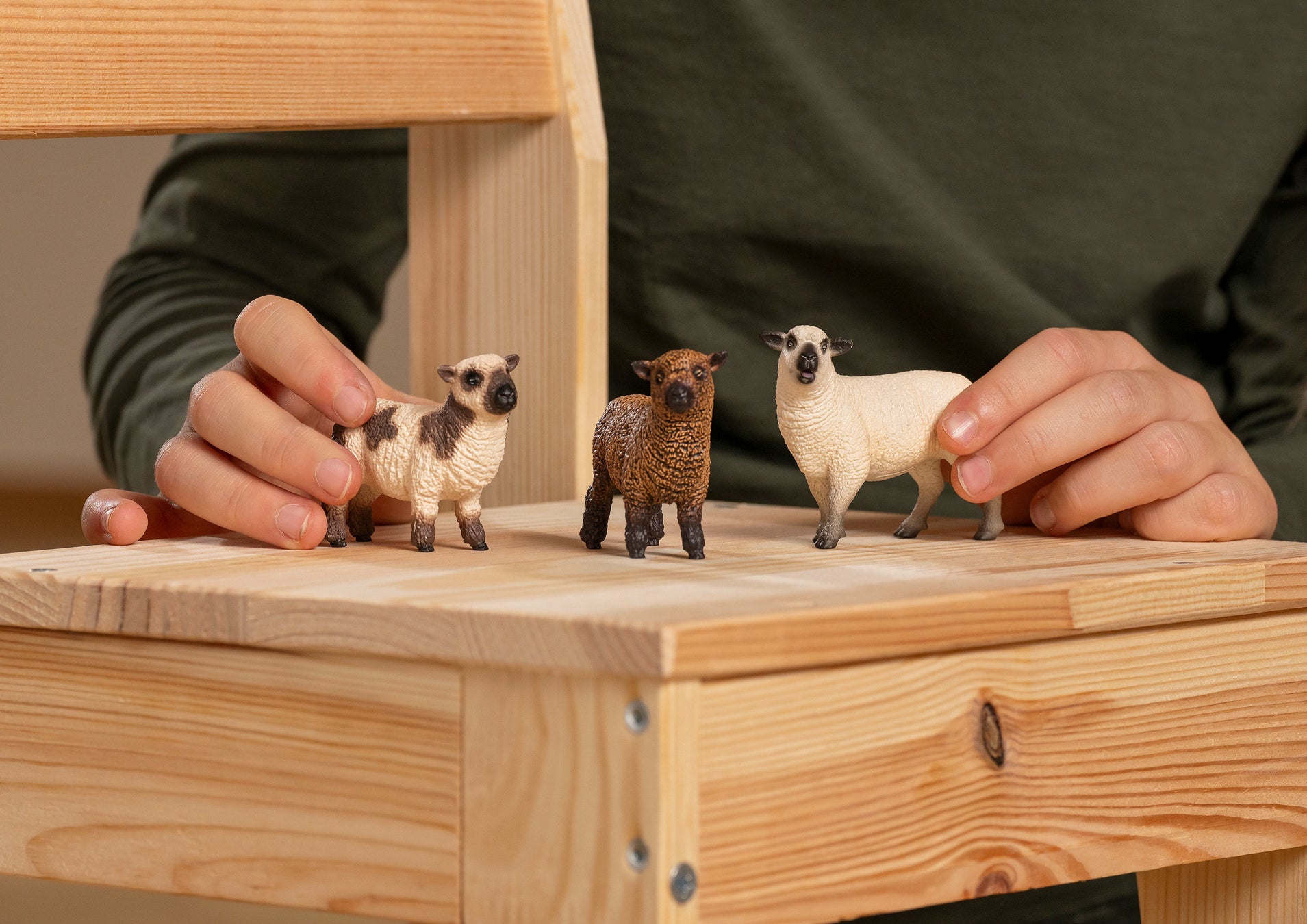 ふわふわのイギリス原産の羊たち。黒い鼻の白いハンプシャー羊。他の2匹の仲間はベビードールサウスダウン羊で、1匹はぶちで、もう1匹はチョコレート色。どれもこのセットでしか入手できません。