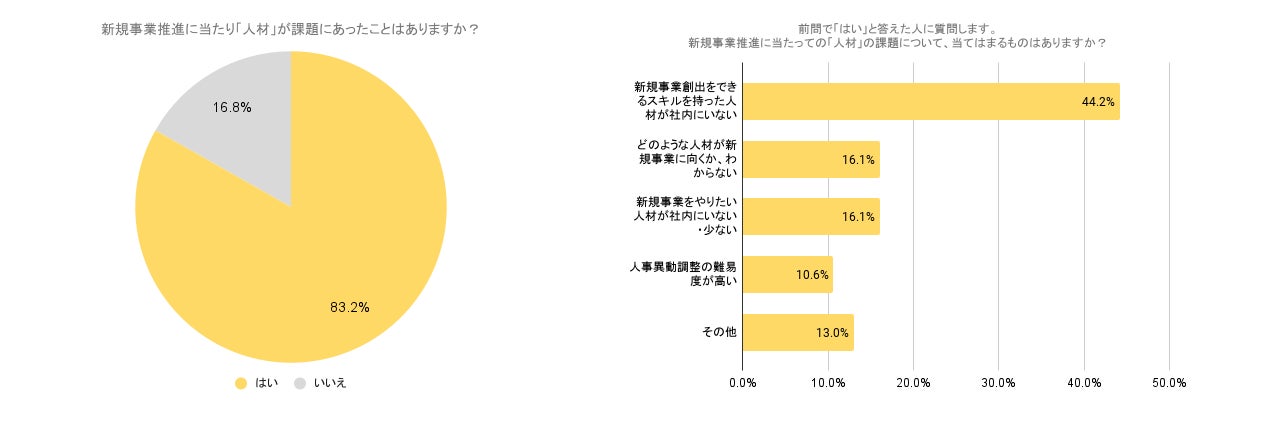 新規事業推進に当たり「人材」に課題を感じているが83.2%。そのうち、「新規事業創出をできるスキルを持った人材が社内にいない」がトップ。