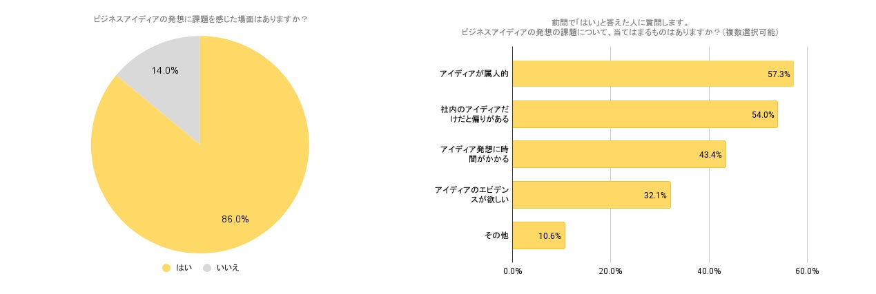 ・「ビジネスアイディアの発想に課題を感じている」が86%。「アイディアが属人的」「社内のアイディアだけだと偏りがある」が原因。