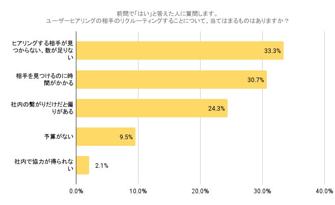 ・ユーザーヒアリングの相手のリクルーティングについて「ヒアリングする相手が見つからない、数が足りない」「相手を見つけるのに時間がかかる」と課題に感じている層が64%。
