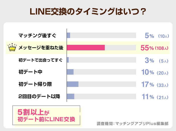 TinderのLINE交換のタイミングは「メッセージを重ねた後」が55%で半数以上の結果でした。