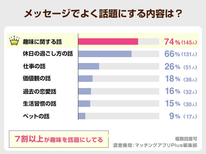 メッセージの話題は、趣味に関する話が74%と最も多い結果でした。次点で休日の過ごし方の話も多く、こちらも60%以上の人が話題にしていました。