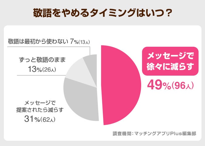敬語をやめるタイミングは「メッセージで徐々に減らす」が最も多く49%でした。中にはずっと敬語のままの人も15%はいるようです。
