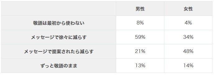 男女別で比較してみると、男性の方が敬語を使わなくなるタイミングが早く、距離の詰め方が早い事がわかりました。