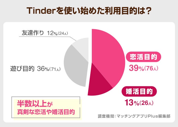 Tinder利用者へのアンケートの結果、恋活での利用目的が39%で最も多い結果でした。婚活目的を含めると、利用者の52%が真剣な出会いを求めていることがわかります。