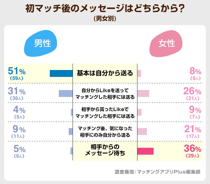最初のメッセージ送信では男女差が明確に出ました。男性は半数以上が自分から送ると回答しているのに対し、女性は自分から送ると回答している人は8%しかいません。