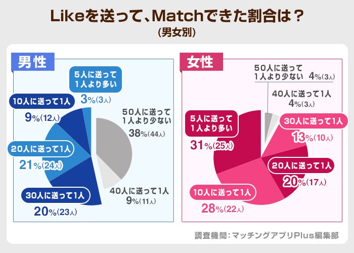 女性は男性よりもMatch率が高く「5人に送って1人より多い」の割合は、男性の10倍以上となっています。