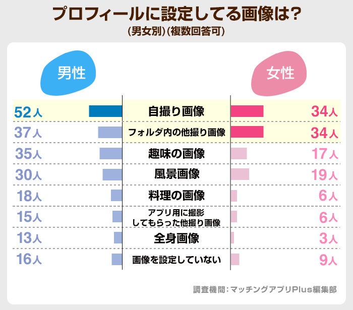 プロフィールに設定している画像で最も多かったのは、男女ともに自撮り画像でした。