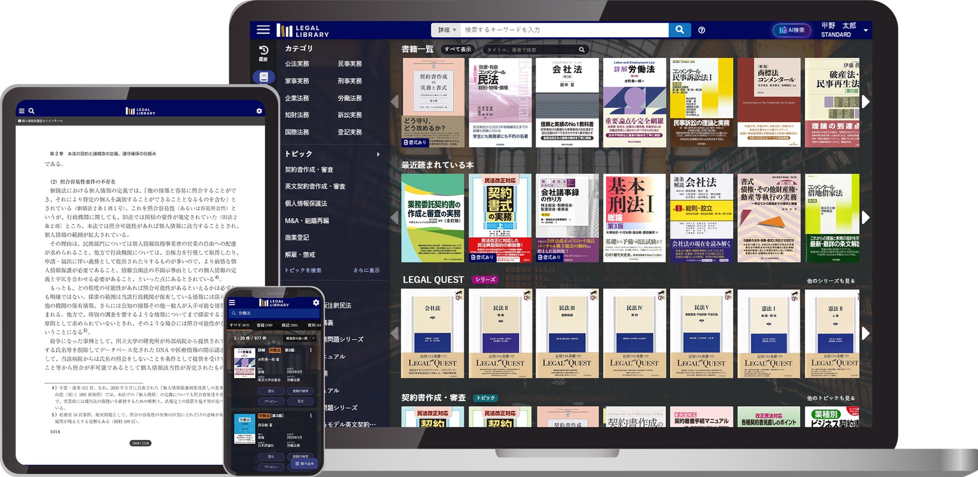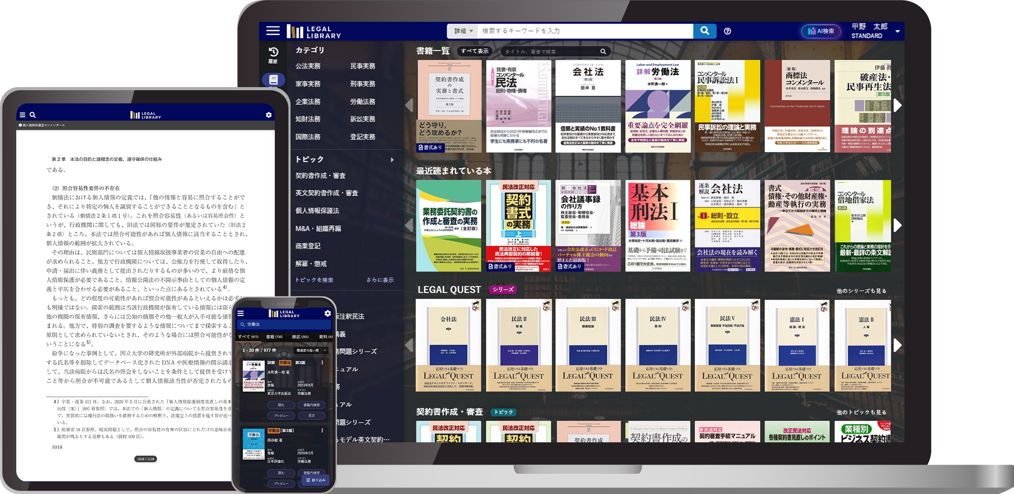 いつでも・どこからでも・何冊でも法律書籍等にアクセスでき、単に法律書籍・雑誌等を閲覧するだけでなく、契約書や議事録のような書式・ひな形を検索し、Wordファイル形式でダウンロードすることもできます。さらに、AI検索を搭載しており、知りたいことや疑問を自然文で入力するだけで、言い換えや周辺概念も踏まえて関連文献を提示するなど、リーガルリサーチを圧倒的に効率化します。