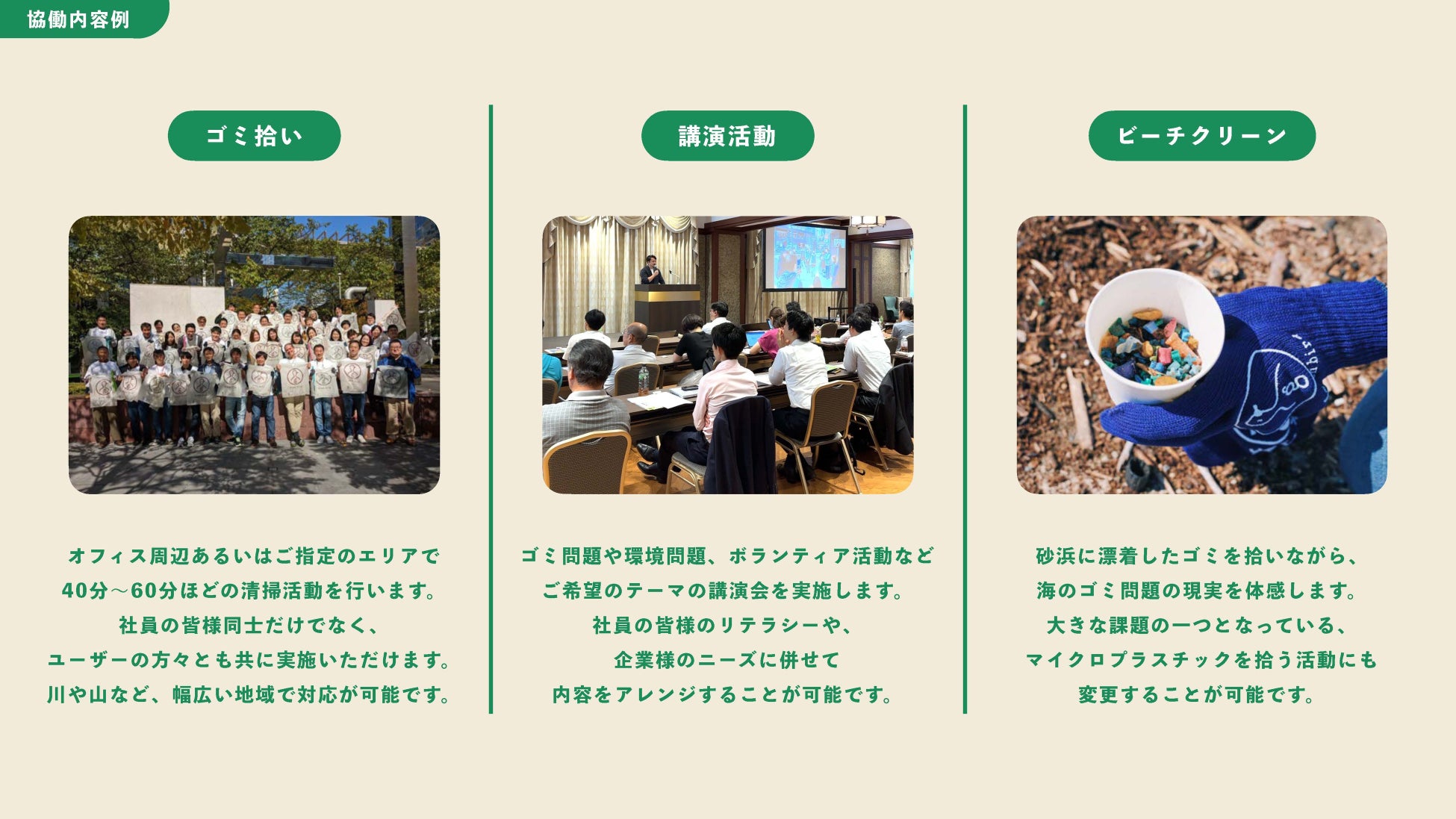 研修・講演とゴミ拾い活動などを組み合わせた内容も実施可能ですので、お気軽にご相談ください。