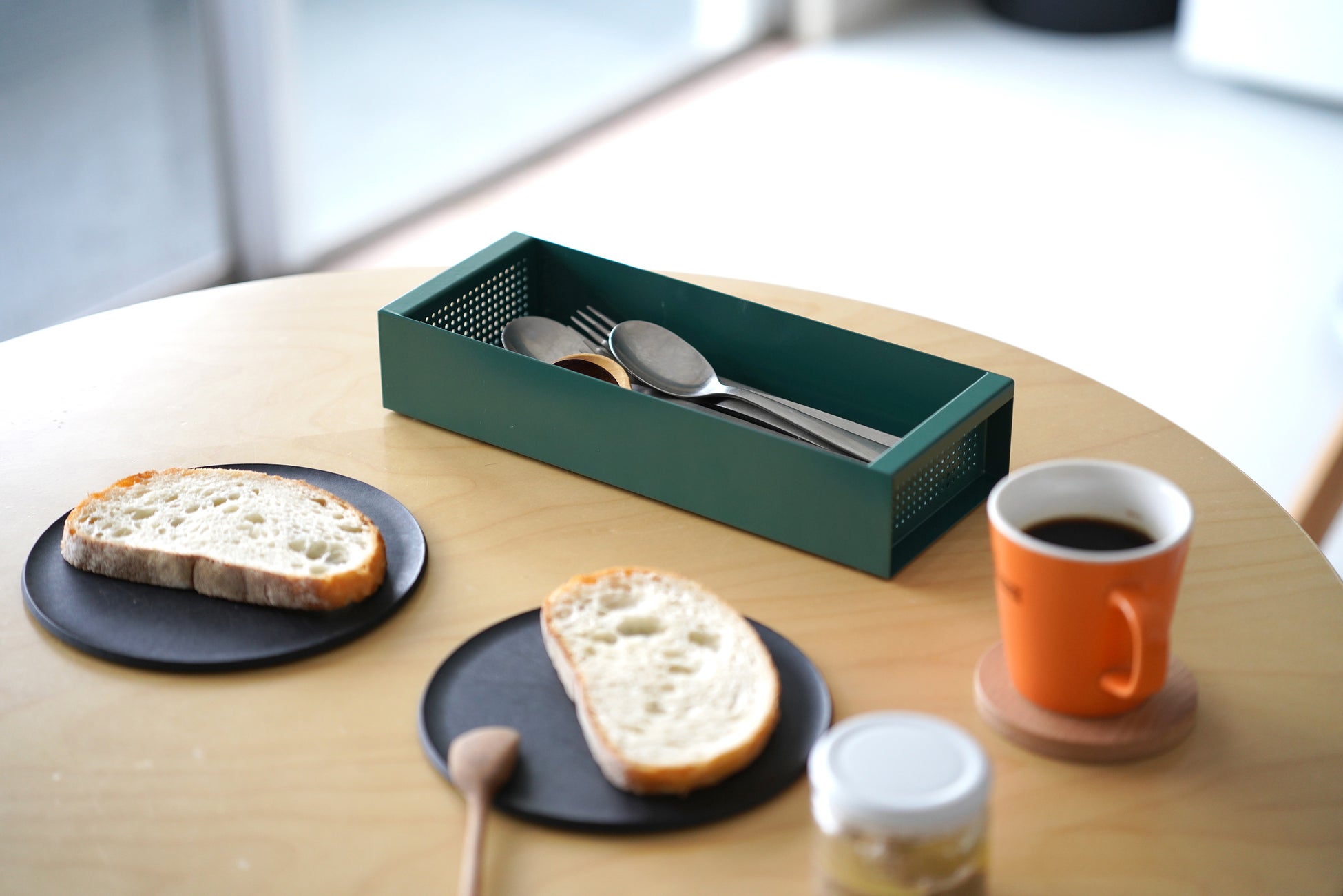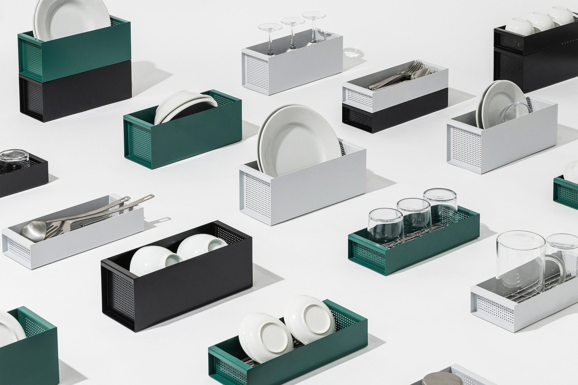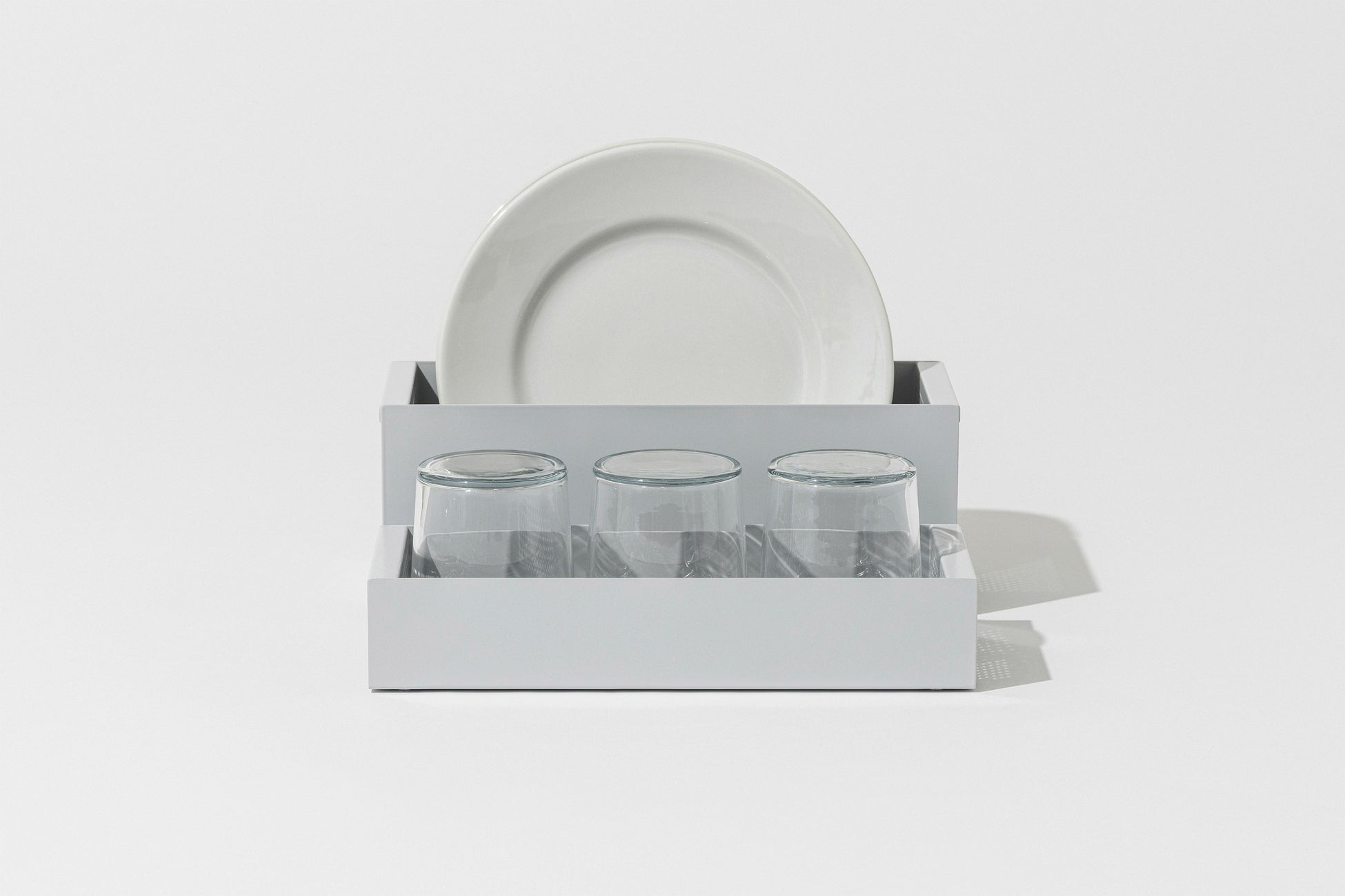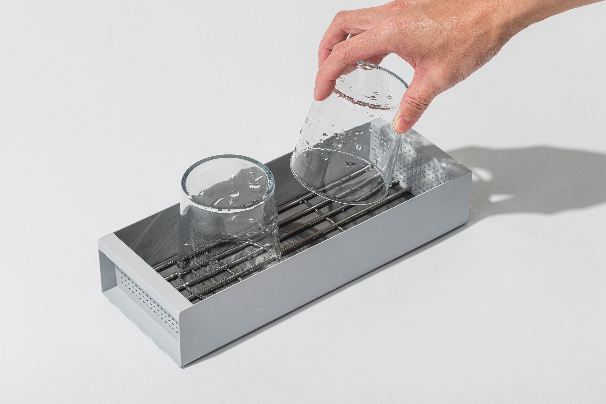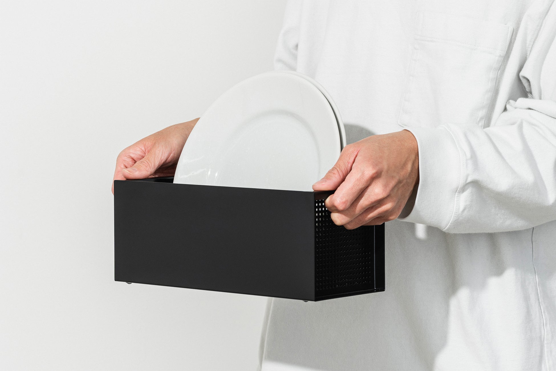 CARGOは小さな持ち手付き。水切り途中でも、乾燥が終わった後でも、食器を入れたまま運んで動かせます。食器棚、テーブル、キッチンワゴン、リビング、CARGOなら置き場所が自由。洗った食器の整理や片付けなど、食器洗い後の「名もなき家事」まで楽にしてくれます。