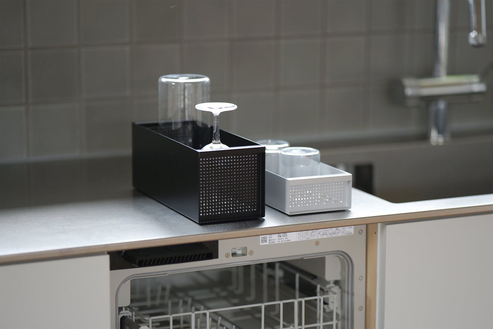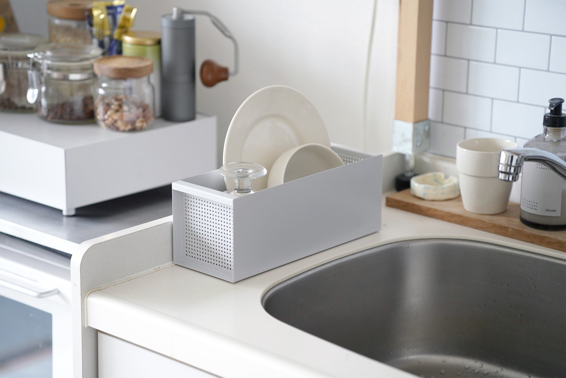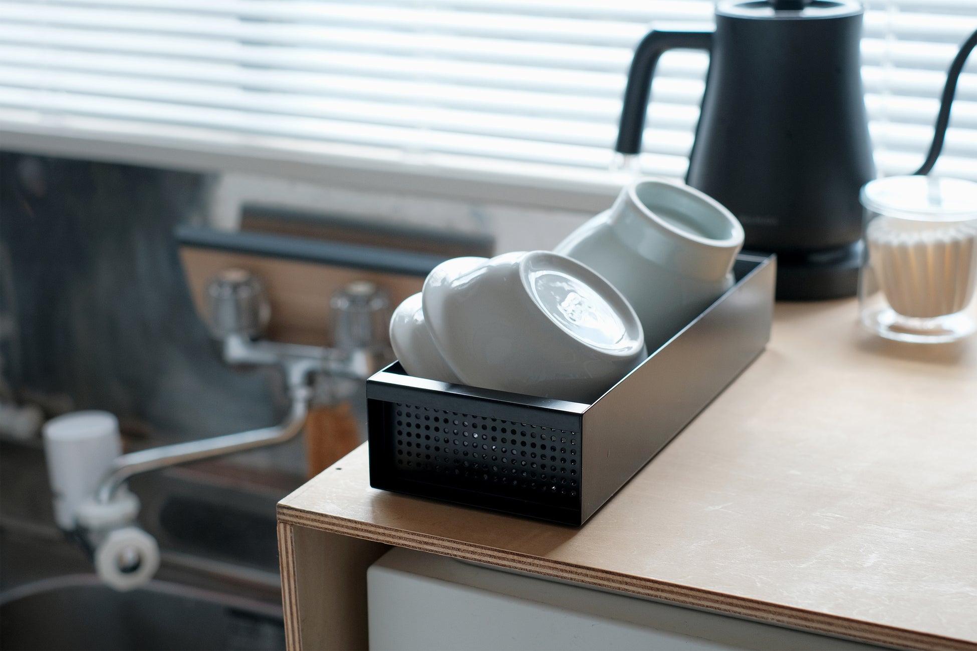 CARGOの設置面は110x290mmと非常にコンパクト。スリムで限られたスペースになることで、CARGOの中では食器が自然と整頓されます。また、コンテナのような箱型の見た目が食器を適度に隠すことで、水切り中でも生活感の少ない整った印象にしてくれます。