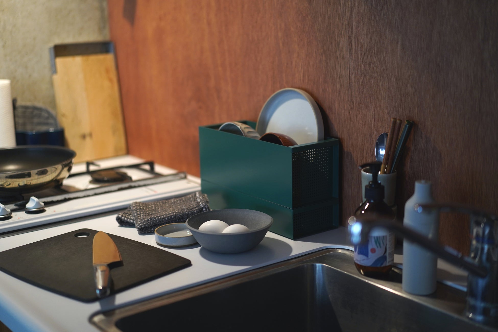 置き場所を自由にするために、CARGO独自のセパレート吸水構造を実現。シンク横で水滴を流す必要がなくなりました。料理のときはサッと動かしたり、使わないときは別の場所に置いたり。置き場所に縛られないので、キッチンやシンク周りのスペースを効率的で柔軟に使えます。