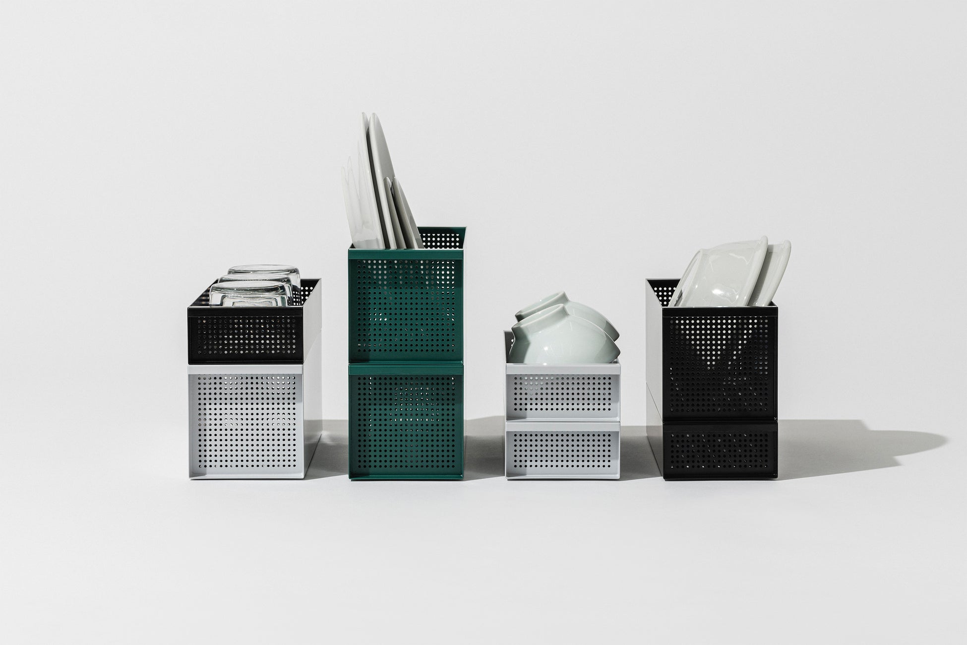 高さ違いの2種類をラインナップ。底のゴム足がぴったり嵌まり、同じサイズでも異なるサイズでも2段まで積み重ねて使えます。積み重ねて縦の空間を活用すれば、さらに省スペースに。下段は中の食器が隠れて見えなくなるので、より整ったすっきりした空間が生まれます。