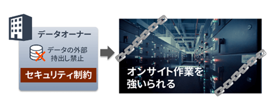 データ分析の需要の高まりに伴い、自社のデータの分析をアウトソースする機会も増えました。しかし、機密性の高いデータを分析する現場では、データの外部持ち出し禁止といったセキュリティ制約を課されることが多くあります。作業場所を選ばず、スケーラビリティがあるクラウドサービスを利用できれば、大幅な時間とコストの削減を期待できますが、実際にはオンサイトでネットワーク接続も禁止される環境での作業を強いられることもあります。