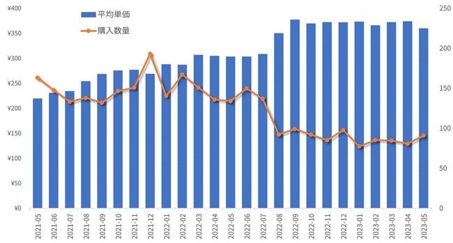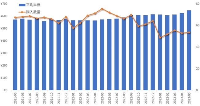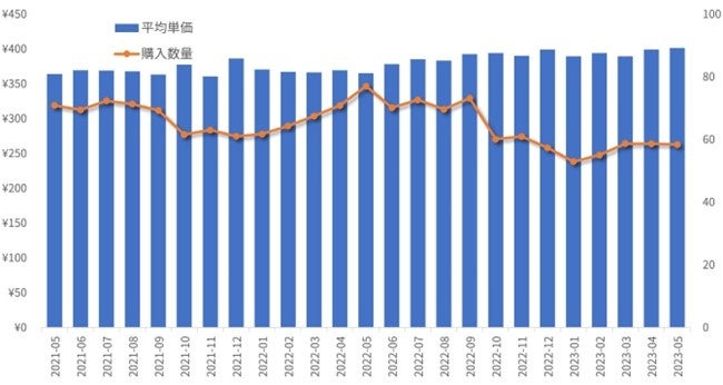 2021年5月と2023年5月の購入金額を比較すると105.1%と市場規模は拡大しているものの、2021年5月と2023年5月の購入数量を比較すると83.3%と減少しています。それは商品の平均購入単価が上昇していることで、購入数量が減っても購入金額は上昇した、ということになりました。