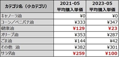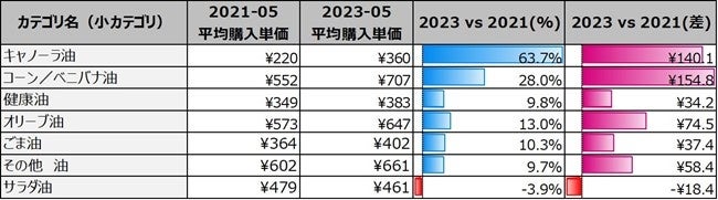 油類カテゴリの平均購入単価を2021年5月と2023年5月で比較した表です。キャノーラ油が63.7%と上昇しており、コーン/ベニバナ油が28%と増加している一方で、他のカテゴリは10%前後上昇、サラダ油に関しては-3.9%と平均購入単価が下がっており、カテゴリ間の価格差が小さくなっています。
