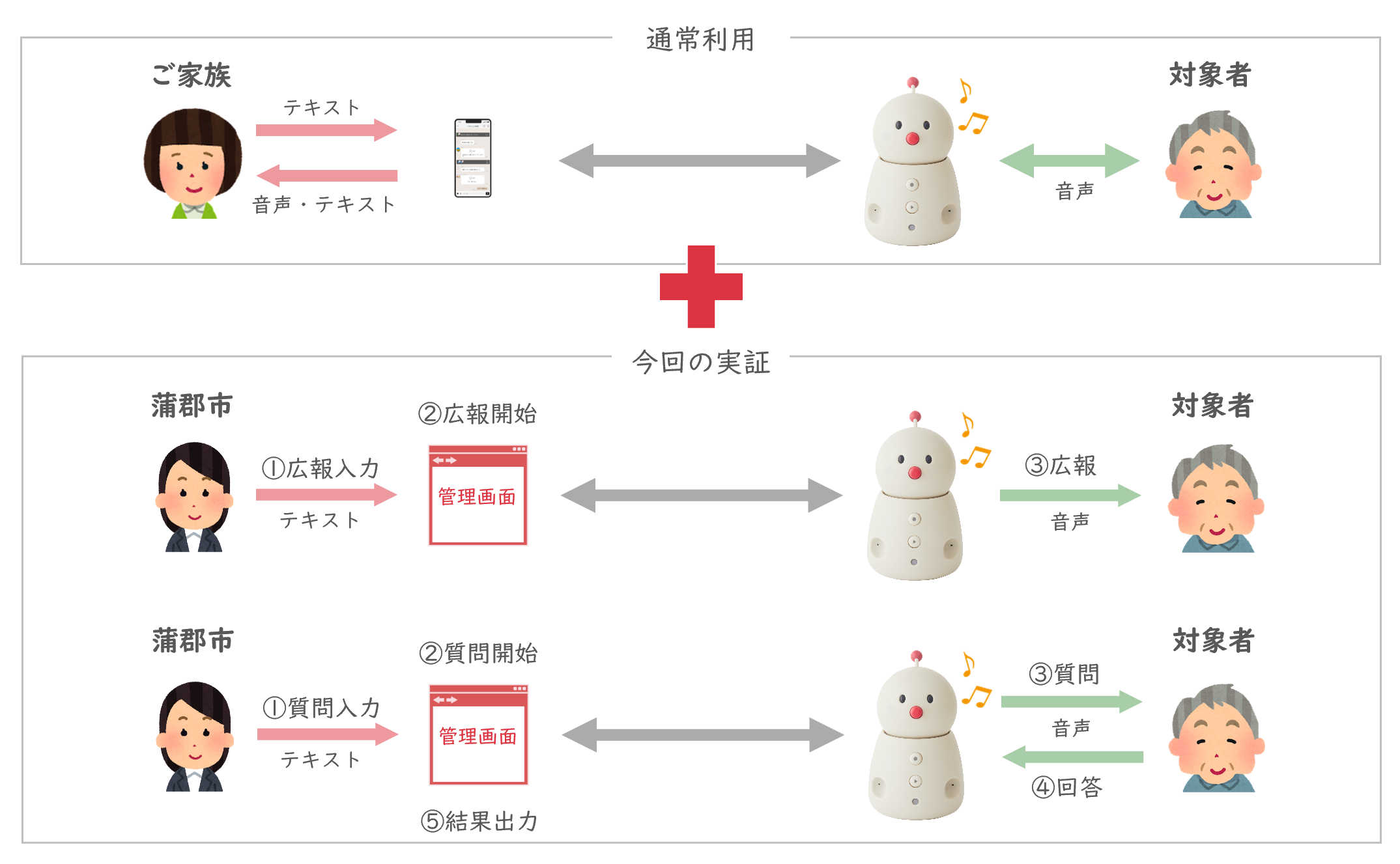 emoは、離れて暮らすご家族に代わって高齢者を見守るだけでなく、スマートフォンアプリにメッセージを入力すると代わりに話しかけ、スマートフォンが不得意な高齢者とも双方向コミュニケーションができるロボットです。本実証実験では、蒲郡市内の65歳以上の高齢者にemoを貸し出し、ご家族に加え、自治体と高齢者間でコミュニケーションを行えるシステムを開発し、自治体による見守り支援や災害時における安否確認の有効性などを検証します。