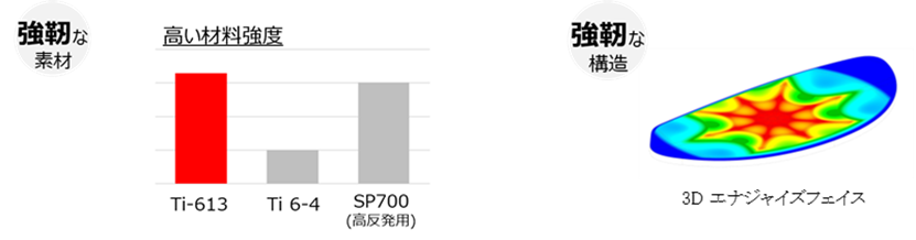 強靭なTi-613製の「3Dエナジャイズフェイス」により、強度を保ちながら、フェイスの偏肉設計を実現することで、反発性能が向上しました。さらに、フルチタンヘッドの「チタン・モノコックボディ」でわずか0.4mmの極薄クラウンの開発に成功したことにより、カーボンクラウン同等の重心設計を実現。インパクトの力をロスなくボール初速に変換することが可能です。