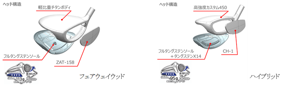 フェアウェイウッドは、ヘッド全体の60%以上もの重量をソールに集中させた、チタン・タングステン合金のマルチマテリアルヘッド。低重心でどんなライからでも高弾道を可能にします。ハイブリッドは、ソール下部に高比重タングステン X14を薄く広げた形状で配置することで低重心化し、ボールの上がりやすさと飛距離性能を向上。