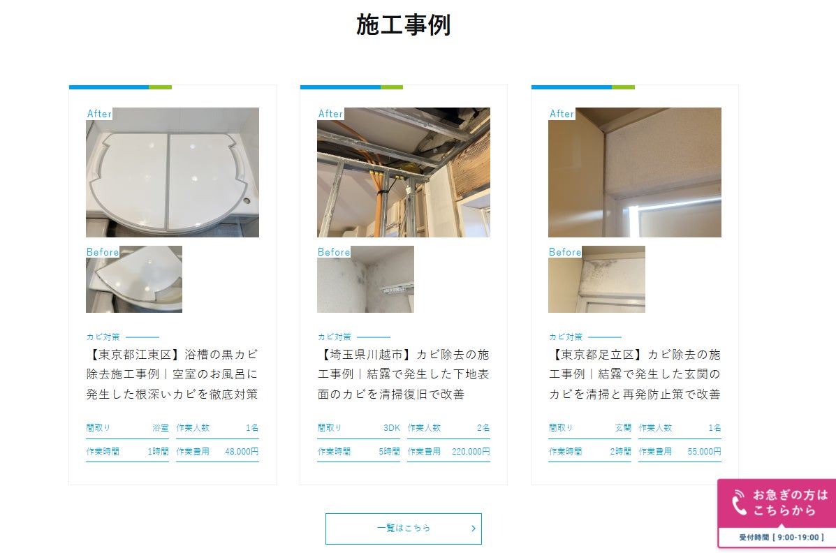 さらに、当社が強みとする「施工事例(ケーススタディ)」も「ペット汚れ」「カビ対策」「火災復旧」「水害復旧」「臭いトラブル」「原状回復工事」の6分野で新設。具体的な案件をもとに課題と解決プロセスを公開することで、透明性の高い情報提供を行い、読者にとって実用的かつ信頼できる知見をお届けします。
