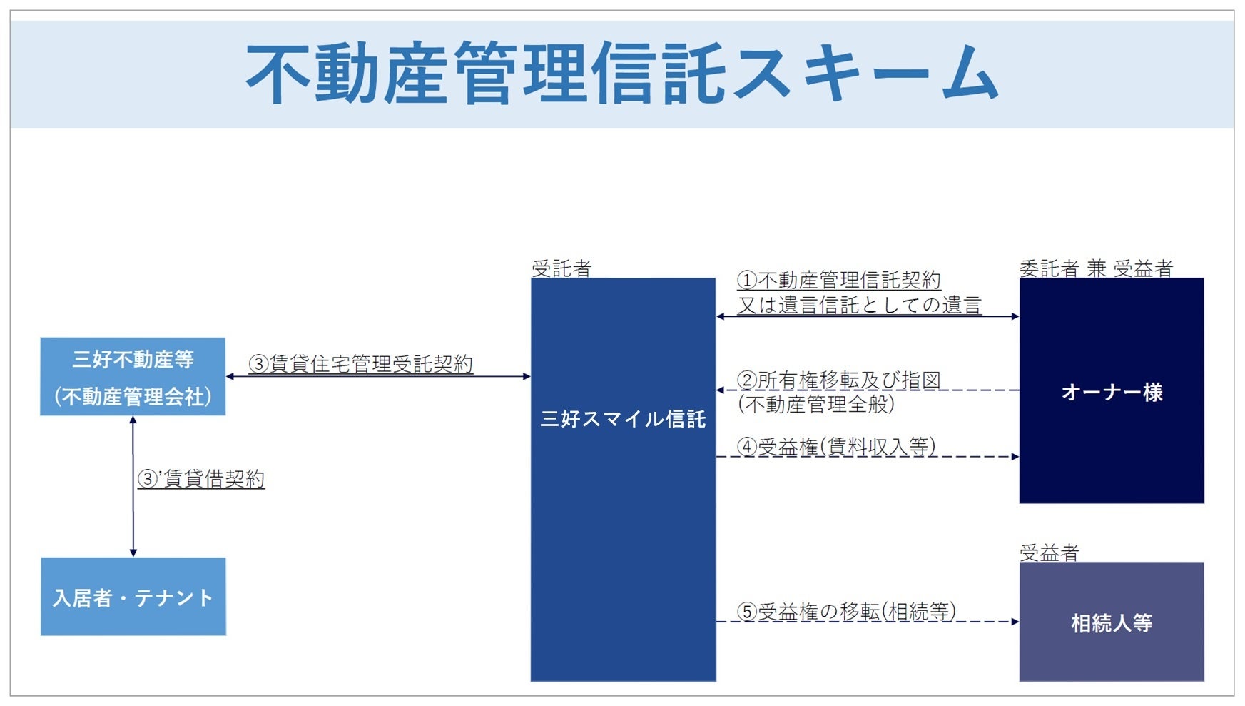 「三好スマイル信託」は、不動産やその他資産を所有する方々との信託契約により、それらの管理や移転、処分等その手続きを一手に引き受け、所有者の意向に沿って資産運用を行います。