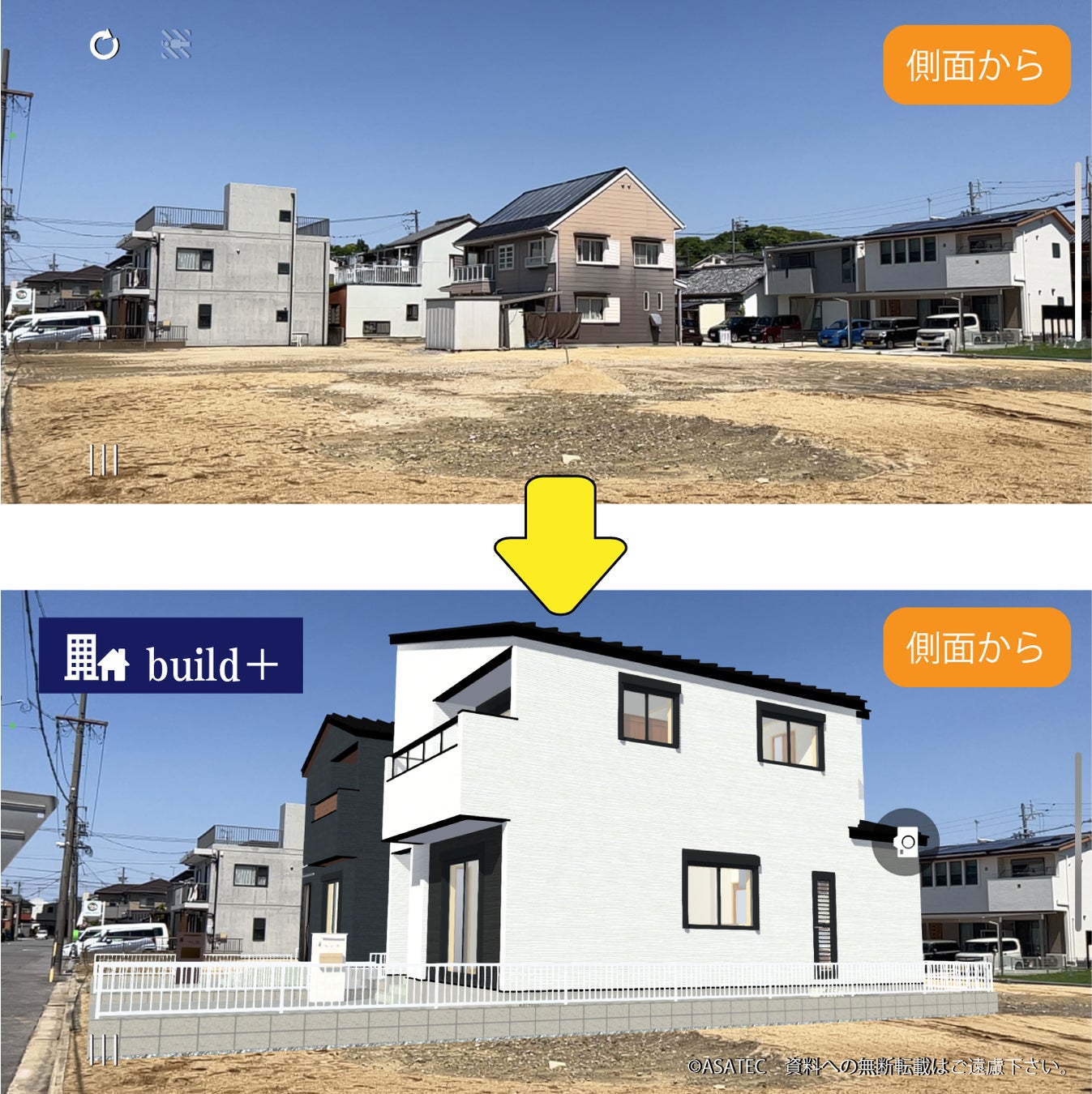 不動産SHOPナカジツが販売する愛知県岡崎市内にある分譲地の着工前の土地に、これから建つ家をARで確認することができます。営業担当者が土地だけでは間取りや広さのイメージを顧客と共有することが難しいため、build+(ビルドプラス)を活用し、建つ家を顧客と共有することを目的とした営業支援サービスとして導入されました。