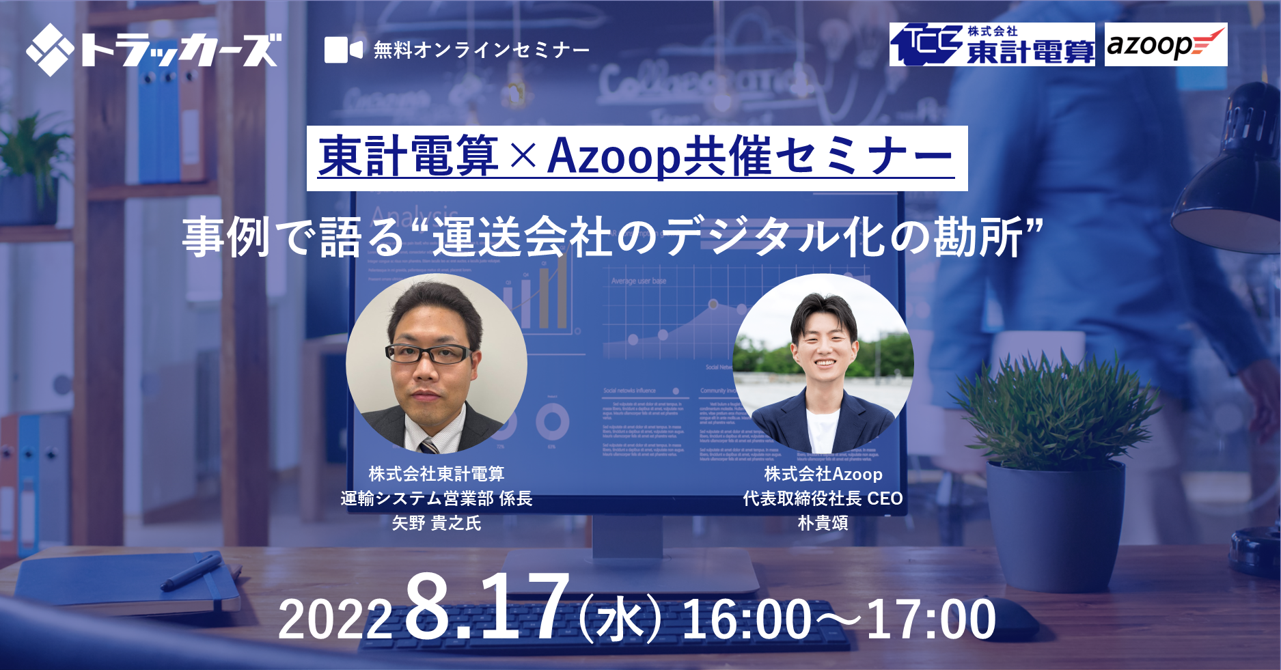 トラック保有企業のための業務効率化プラットフォーム「トラッカーズ」(https://market.trck.jp/)を運営する株式会社Azoop(アズープ、本社:東京都港区、代表取締役:朴 貴頌、以下:Azoop)は8月17日(水)に、株式会社東計電算の矢野様をお迎えし「事例で語る“運送会社のデジタル化の勘所”」を開催することをお知らせいたします。