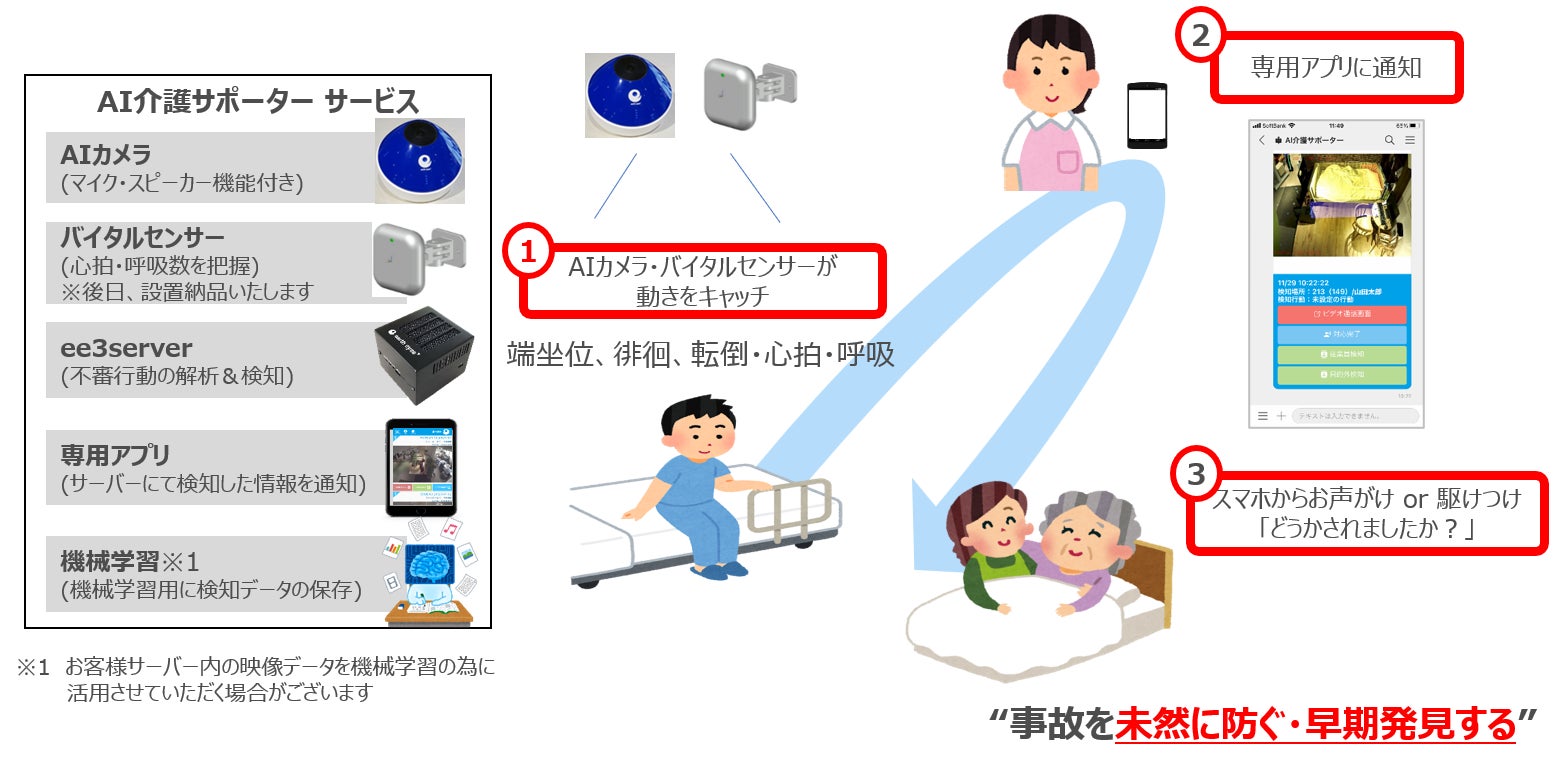 AI搭載カメラで実績を持つアースアイズ株式会社(本社:東京都港区、代表:山内三郎)は、2019年より初代AI介護サポーターを販売し、導入いただいた施設の意見を取り入れながら常に改良を重ねてまいりました。今回、展開するAI介護サポーターは、人の五感のように繊細な機能がついています。