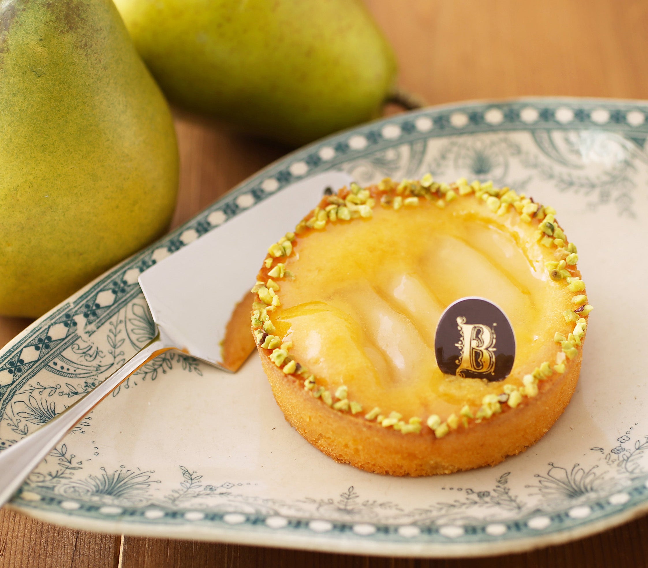 発酵バターとアーモンドの風味豊かな生地に、みずみずしい洋梨をのせて焼き上げたケーク。初夏のティータイムにおすすめのフルーティーで贅沢な味わいで、軽く冷やしても美味しくいただけます。