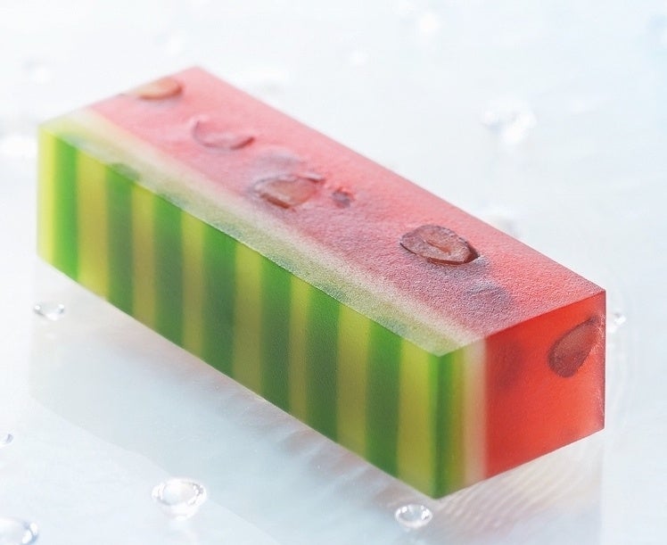 寒天と水を煮溶かして砂糖を加えた涼やかな錦玉羹(きんぎょくかん)の「ささらがた」は、一つ一つを丁寧に職人が手作業で作り、すいかのタネは小豆で表現。見た目が鮮やかな夏ならではの逸品で、冷やすとより一層美味しさを堪能できます。