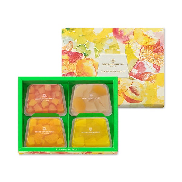 フルーツに合わせて相性の良い洋酒を香らせ、優しい甘みに仕上げたつるんとしたのどごしのゼリー。ひとつのゼリーの中にはフルーツを贅沢に2種類敷き詰め、どこから食べても果実のジューシーさを味わえます。味はアップル&イエローピーチ、マンゴー&みかん、ピーチ&アプリコット、パイン&白ぶどうの4種類。