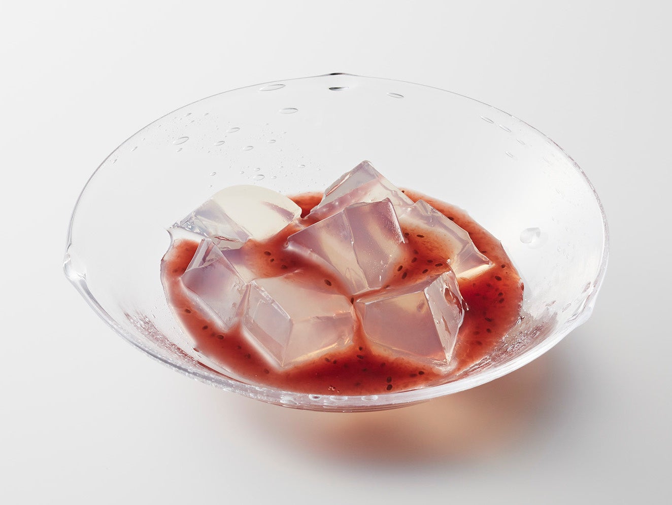はじける食感を目指し、試作を重ねてたどり着いた固さと大きさで、寒天の弾力を楽しめます。食感のアクセントにチアシードを入れ、さわやかな酸味が効いたざくろソースとの相性が抜群です。