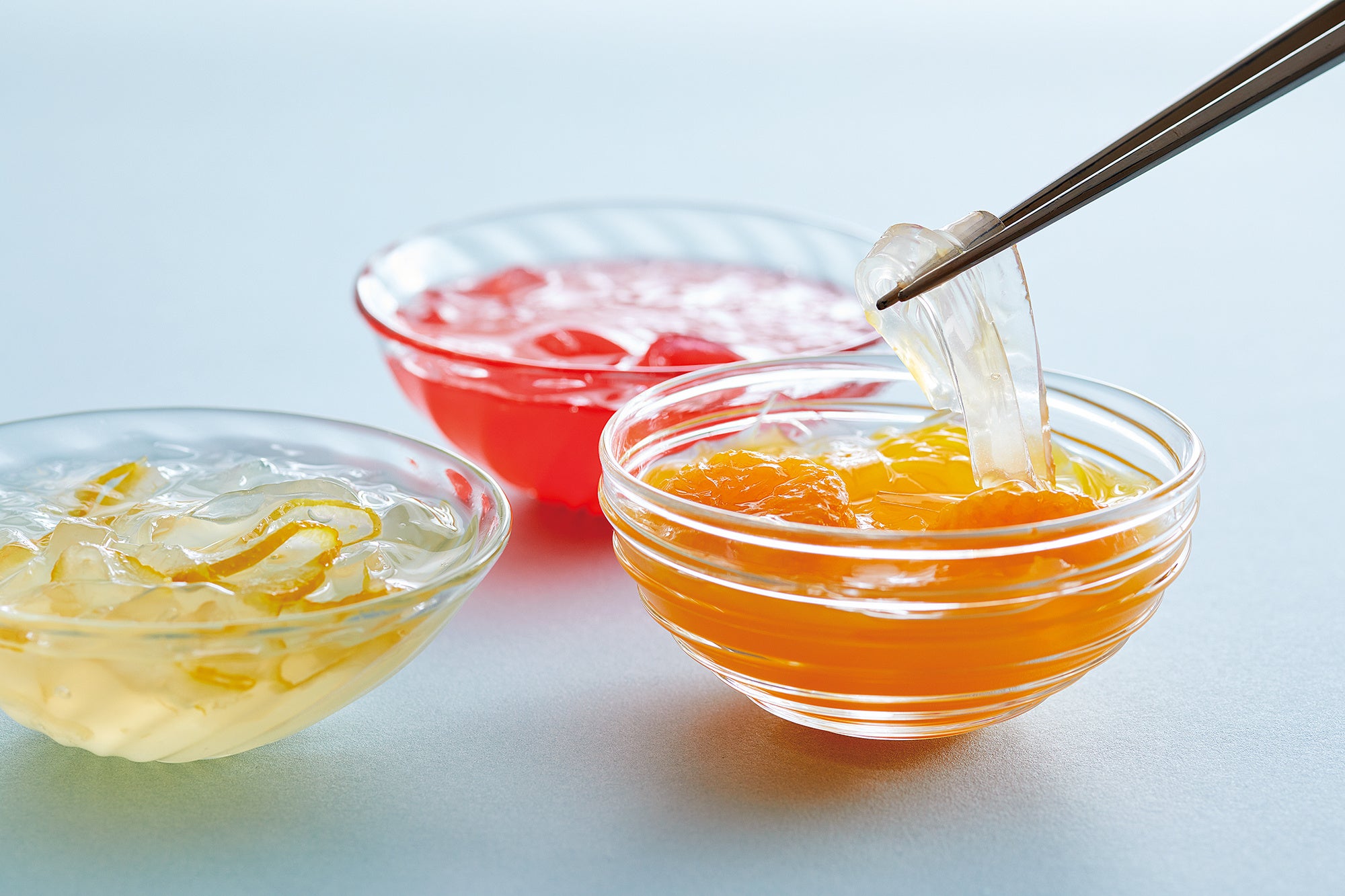 奈良県吉野の本葛粉を使用した葛きり入りのゼリー。器に盛り、お箸でやさしくくずすと葛きりがほどけて、ゼリーはぷるぷるのジュレに早変わり。味は、名高い高知と愛媛産の完熟した気品ある香りと甘みの柚子、夏が旬の苦味や渋みがなく爽やかな酸味の赤しそ、和歌山の太陽をたくさん浴びた瑞々しい甘みの温州みかんの3種。