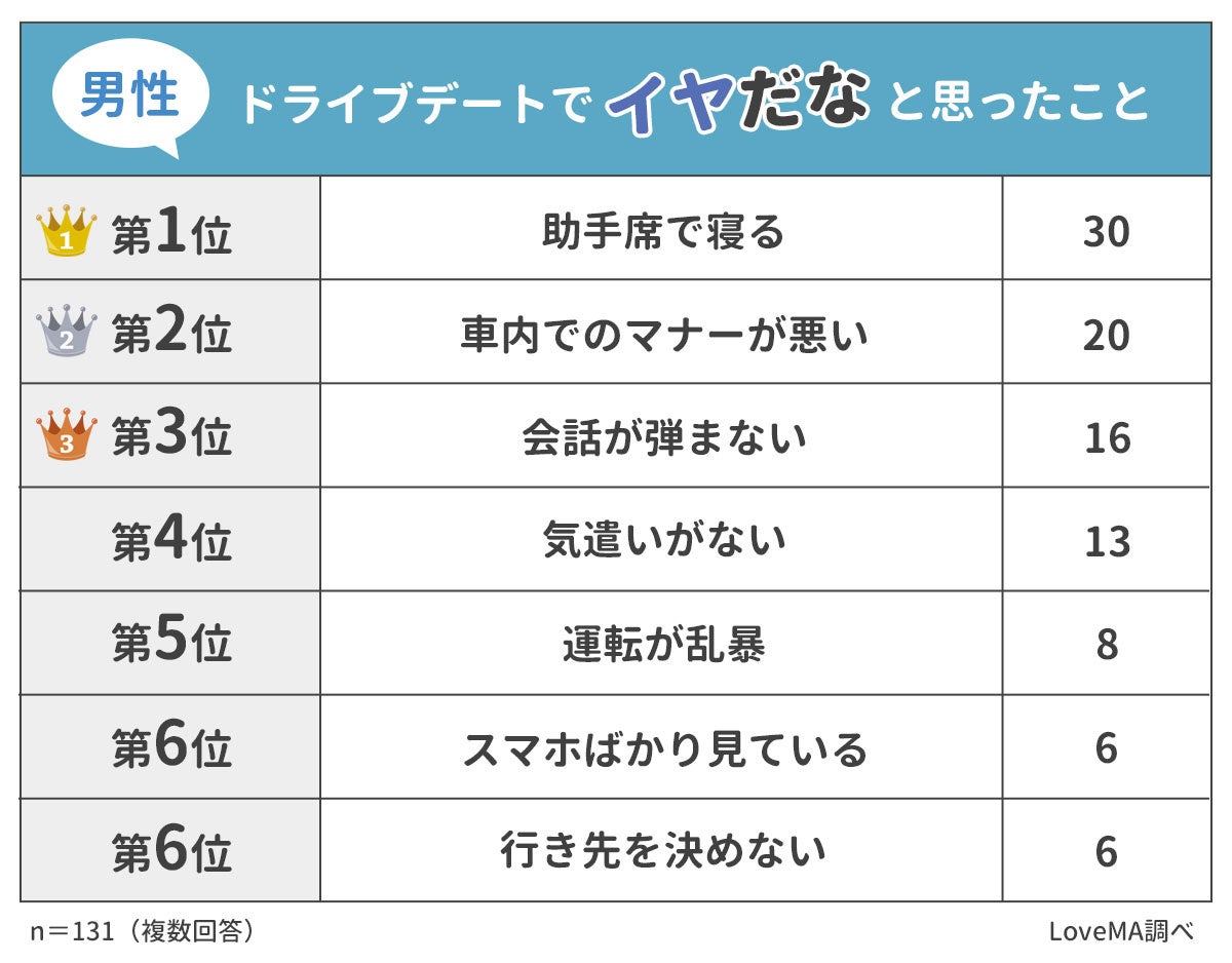 続いて、男性に「ドライブデートでイヤだなと思ったこと」を聞いたところ、1位は「助手席で寝る(30人)」でした。