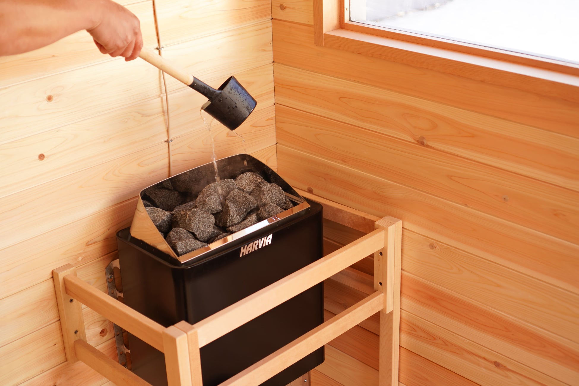 熱したサウナストーンに水をかけるロウリュは、お好きな量・タイミングで自由にお使いいただけます。サウナバケツには、リラックス効果のある「白樺の葉の香り」のアロマオイルを入れてご用意しています。