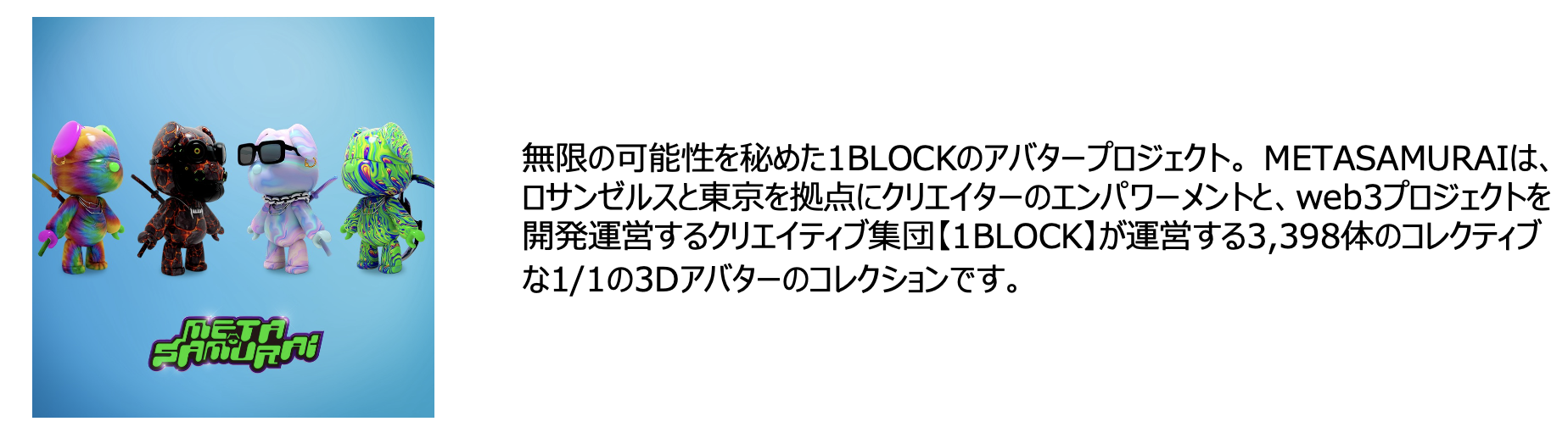 無限の可能性を秘めた1BLOCKのアバタープロジェクト。 METASAMURAIは、ロサンゼルスと東京を拠点にクリエイターのエンパワーメントと、web3プロジェクトを開発運営するクリエイティブ集団【1BLOCK】が運営する3,333体のコレクティブな1/1の3Dアバターのコレクションです。