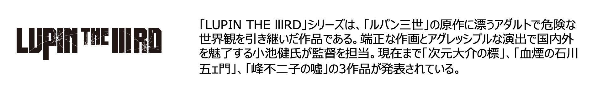 「LUPIN THE ⅢRD」シリーズは、「ルパン三世」の原作に漂うアダルトで危険な世界観を引き継いだ作品である。端正な作画とアグレッシプルな演出で国内外を魅了する小池健氏が監督を担当。現在まで「次元大介の標」、「血煙の石川五ェ門」、「峰不二子の嘘」の3作品が発表されている。